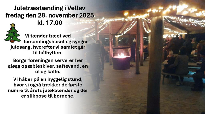 Vi tænder træet ved forsamlingshuset og synger julesang, hvorefter vi samlet går til bålhytten.